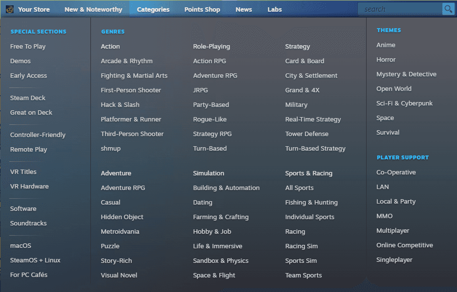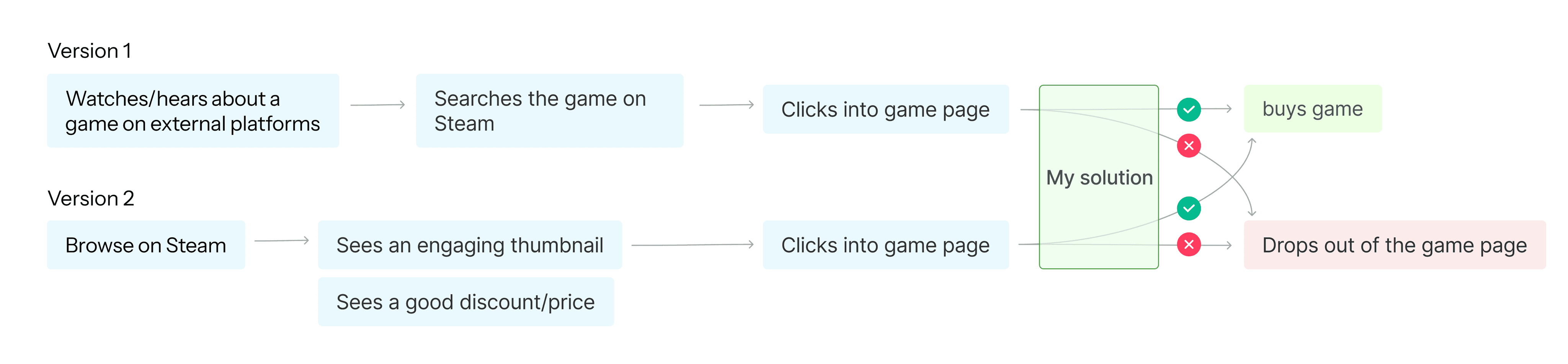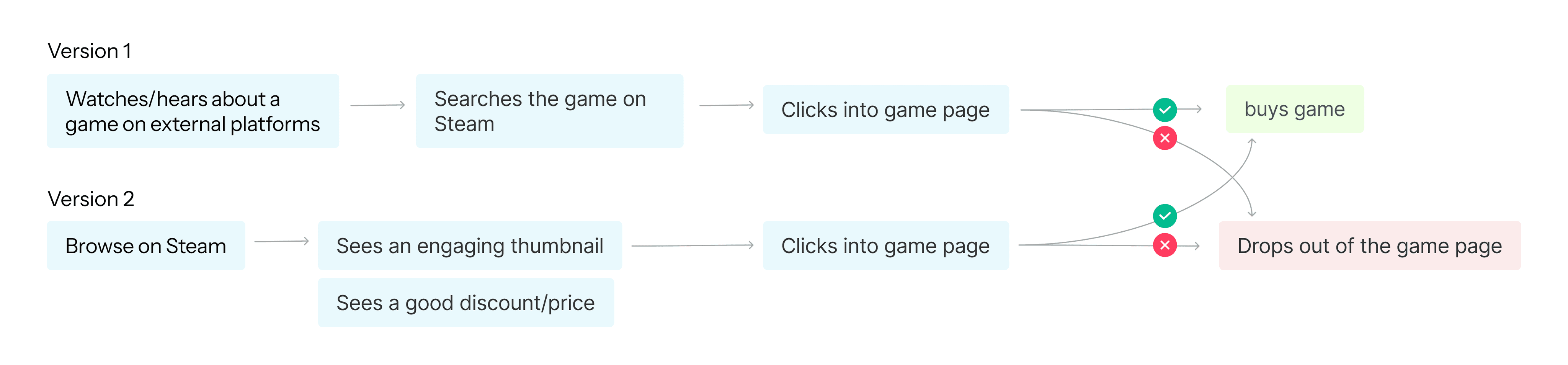 Although Steam offers a large number of game genres and categories, my research revealed that the core issue doesn't actually lie within the browsing or filtering processes. Instead, the challenge arises after users click into a game page, where they feel uncertain about a game, leading to hesitation and ultimately, drop off.