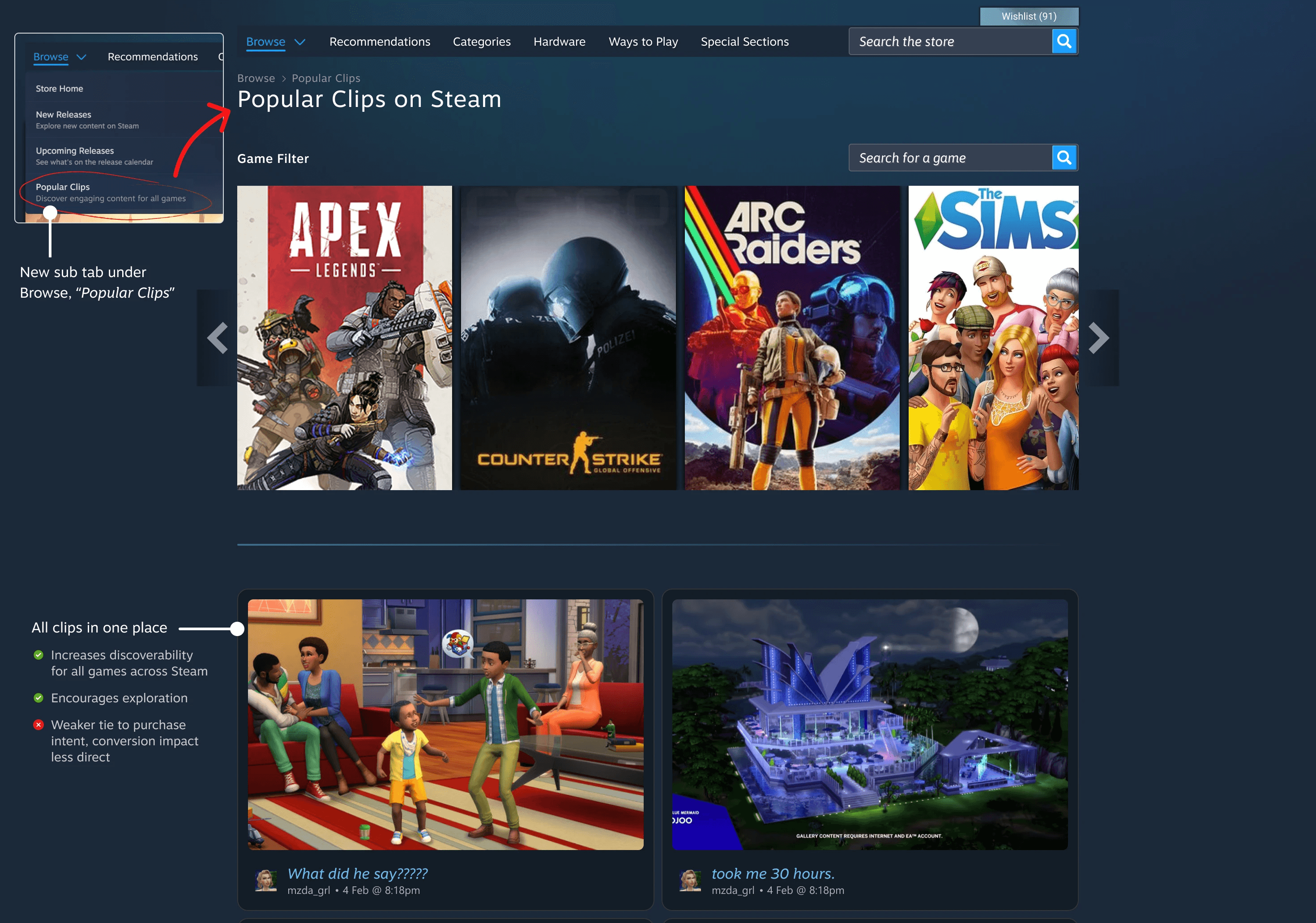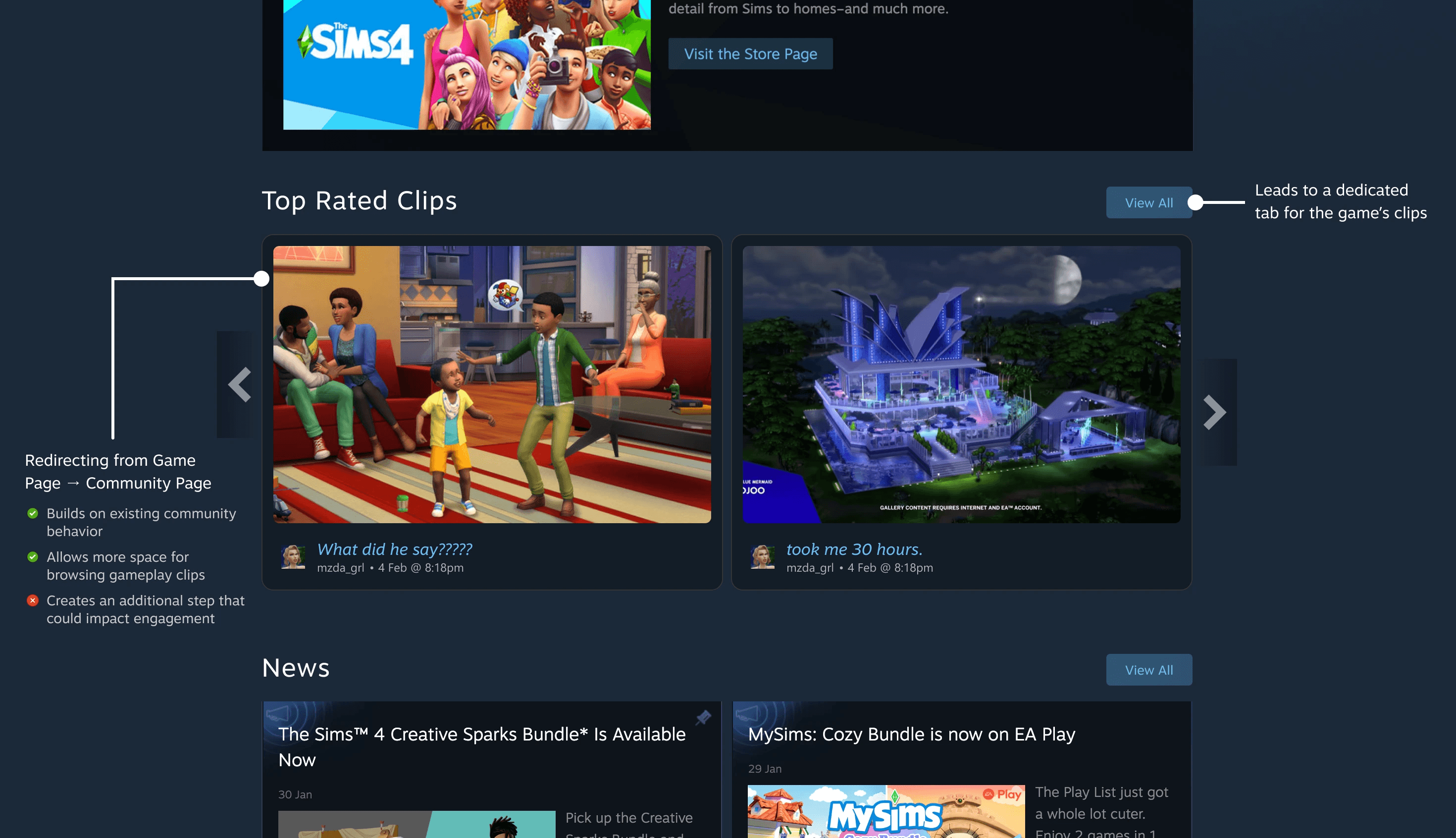 After analyzing and conducting competitive analysis on similar websites and apps on how they keep users interested, and understanding how Steam has already built a starting foundation for clips and videos, I concluded that showing the short-form content (clips and videos) on the specific game page, instead of redirecting users back-and-forth, was an effective way to maintain user engagement and influence purchasing decisions.