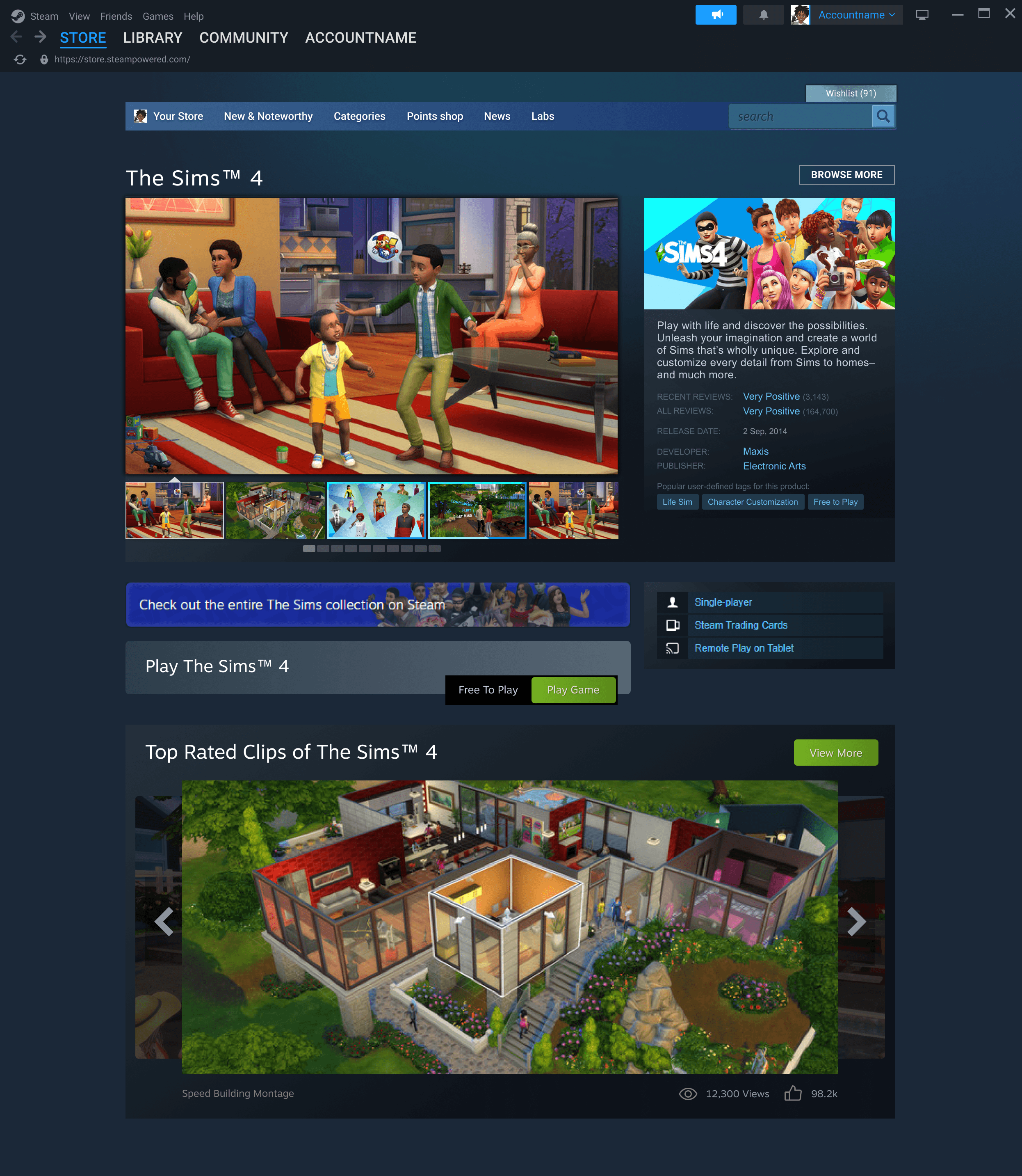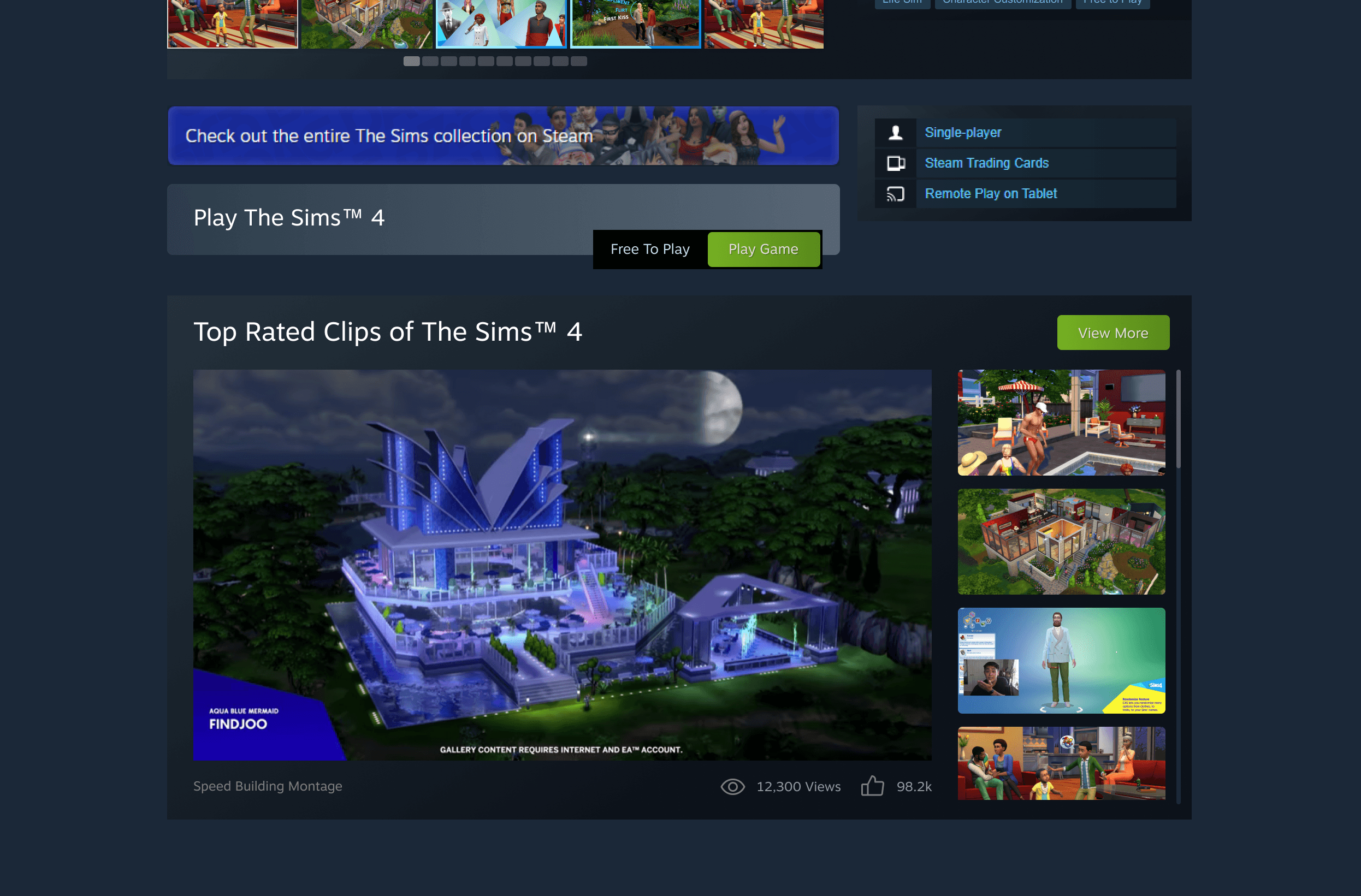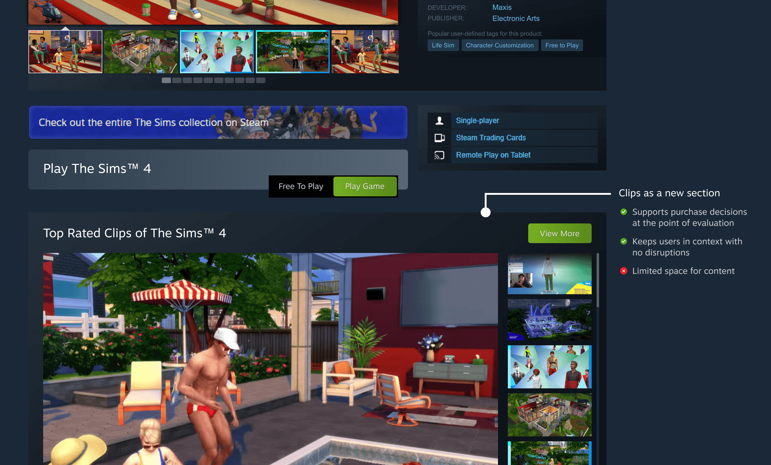 Clips are presented in a horizontally scrollable carousel, continuously playing top-rated clips. Similar to the current image gallery interactions on Steam.